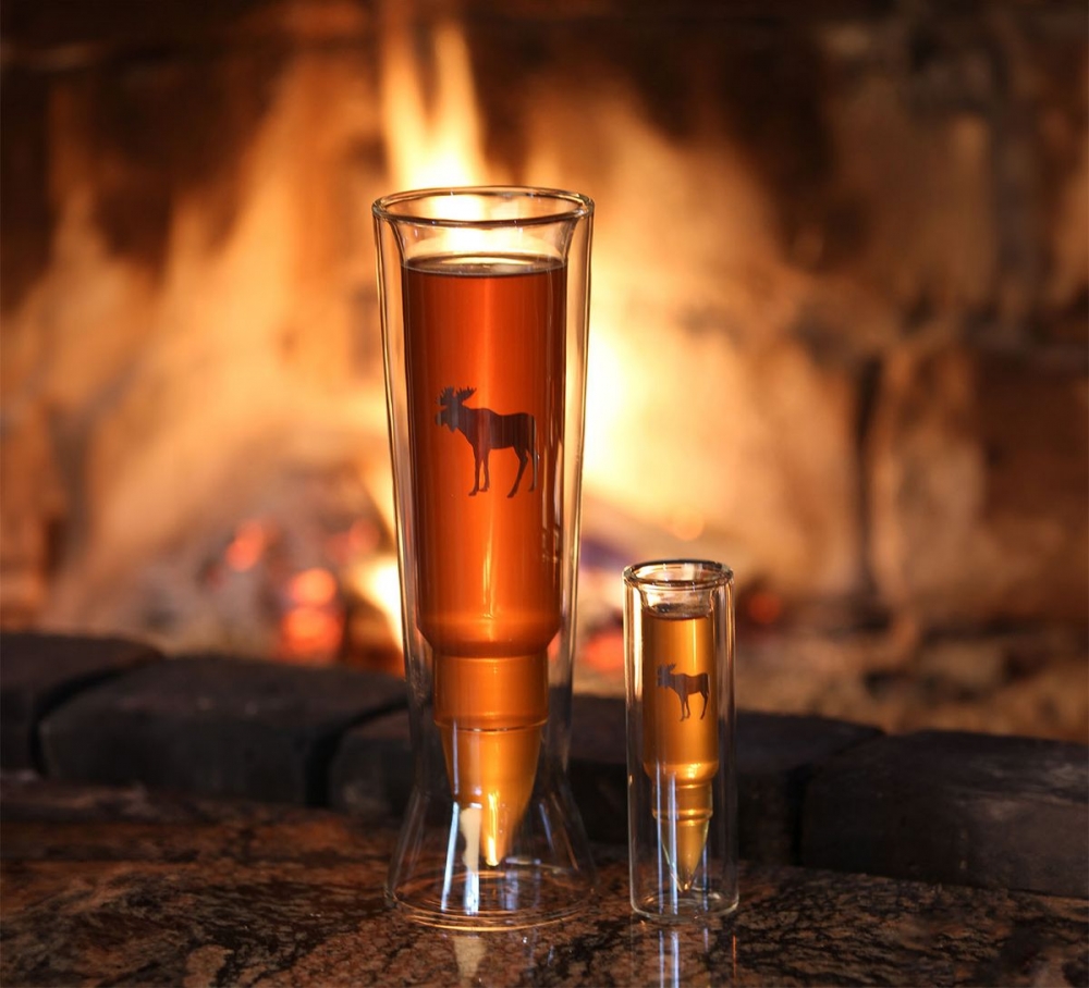 Det ultimate ølglasset til jegeren! Silver Moose - the hunter's finest ammunition! Utformet som en patron, i dobbeltglass. Dette sikrer at drikken ikke blir varm når du holder den i hånden din.