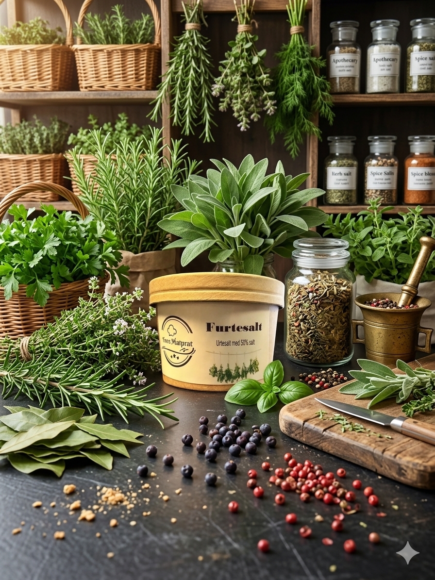 Urtebrødkrydder uten salt inneholder: Salvie, basilikum, persille, rosmarin, sort pepper, ramsløk og oregano