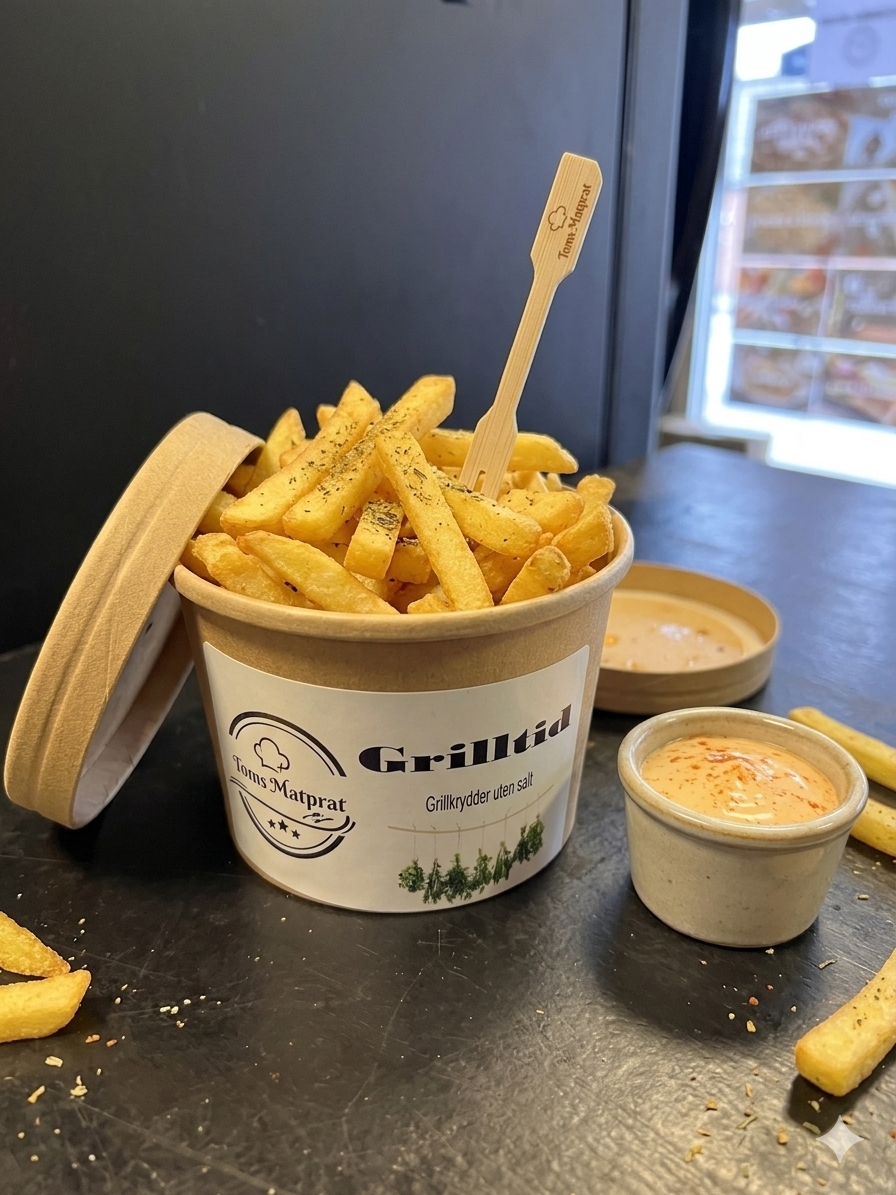 Her finner du Toms matprat krydderserie. En krydderserie helt uten sukker og salt. Da kan du bestemme helt selv hvor mye salt du vil bruke i maten din. Krydderet er pakket på pappboks, miljøgodkjent og godkjent for matvarer.