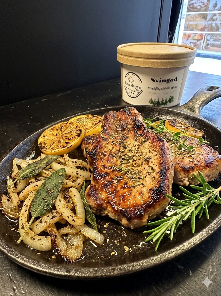 Svine/kylling grillkrydder uten salt. Inneholder: Sitron, løk, hvitløk, paprikaflak, sort pepper, timian, chili og karve
