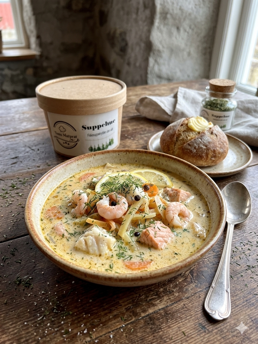 Fiskesuppekrydder uten salt. Inneholder: Timian, gressløk, dill, sitron, løk, estragon, sort pepper, malt sellerifrø, ramsløk og malt laurbærblad