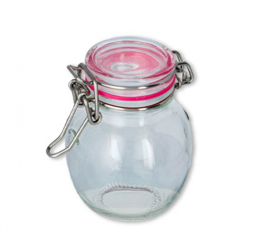 Glasskrukke av klart glass med hengslet lokk og tetningslist. Passer til oppbevaring av krydder, syltetøy, krem, kakepynt, godterier m.m. Glasskrukkene kan males med glass- og flisemaling, glass- og porselenspenner.