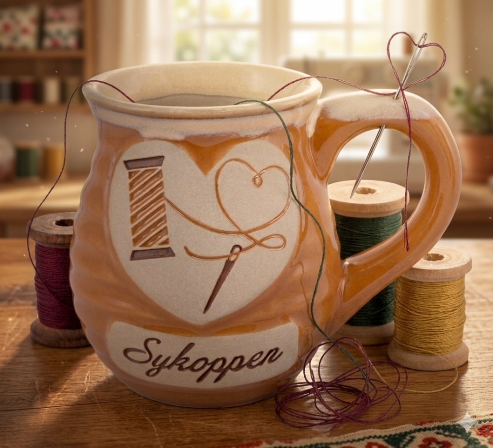 Den ultimate sykoppen i okergul for den som elsker sying og håndarbeid! Fyll koppen med din favorittdrikk og sett deg til rette med prosjektet ditt.