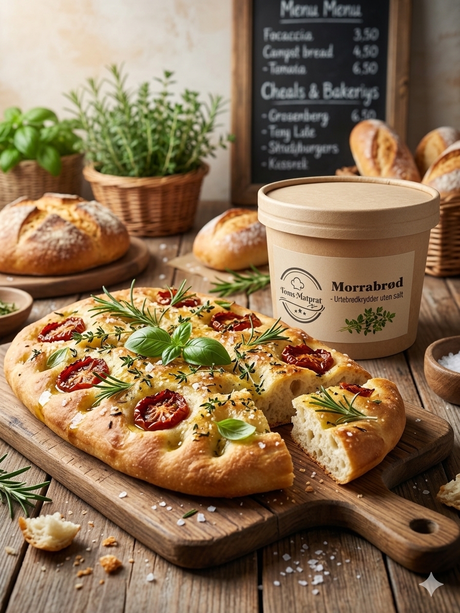 Urtebrødkrydder uten salt inneholder: Salvie, basilikum, persille, rosmarin, sort pepper, ramsløk og oregano