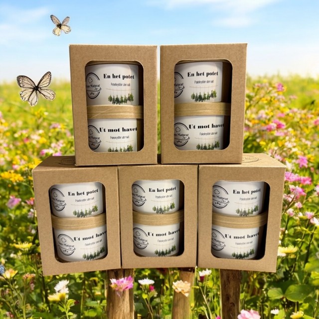 Få en pen krydderboks med to av våre bestselgere. En het potet og Ut mot havet. Dette er potetkrydder til stekte poteter og andre grønnsaker. Ut mot havet passer til Sei, torsk, kveite, brosme, lange, uer, hyse og skalldyr. Begge er uten salt